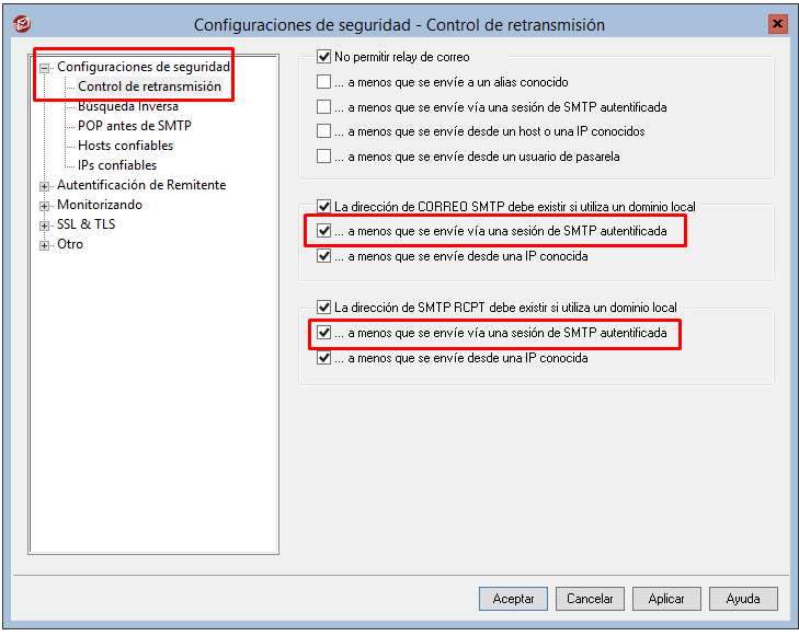 - En Seguridad, Ajustes de Seguridad --> Control de retransmisión: