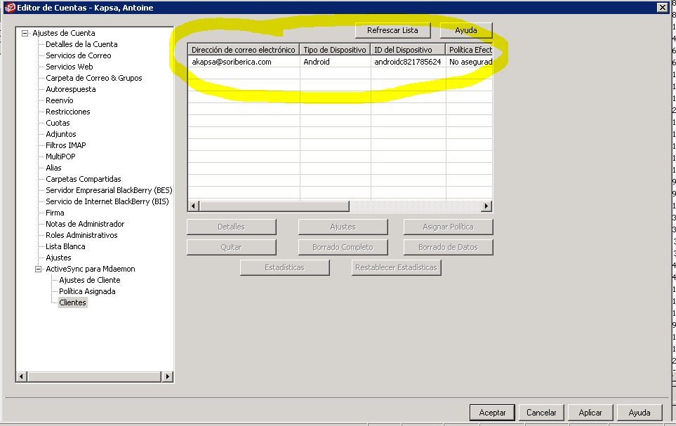 Limpiar / Vaciar el conjunto de Dispositivos móviles (ya no utilizados), que le aparezcan registrados al Usuario en el apartado (ActiveSync para Mdaemon / Clientes. Dentro de la Configuración de la Cuenta).